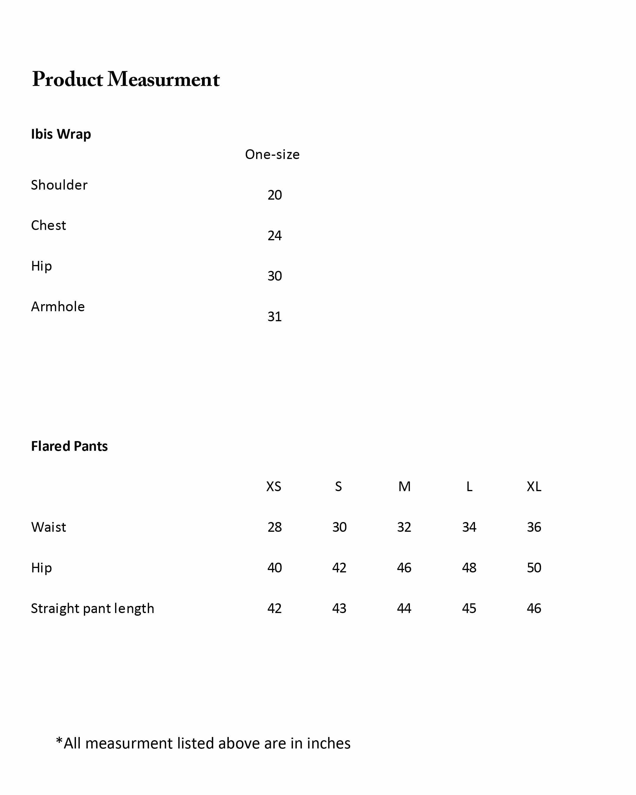 *Please note that this is a one-sized style and the size selection applies to the camisole and flared pants.